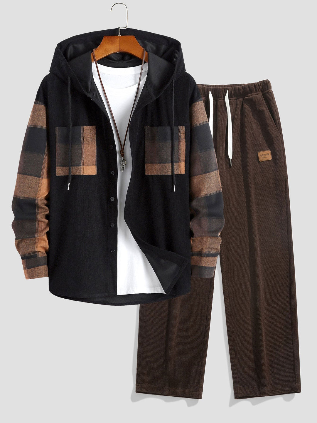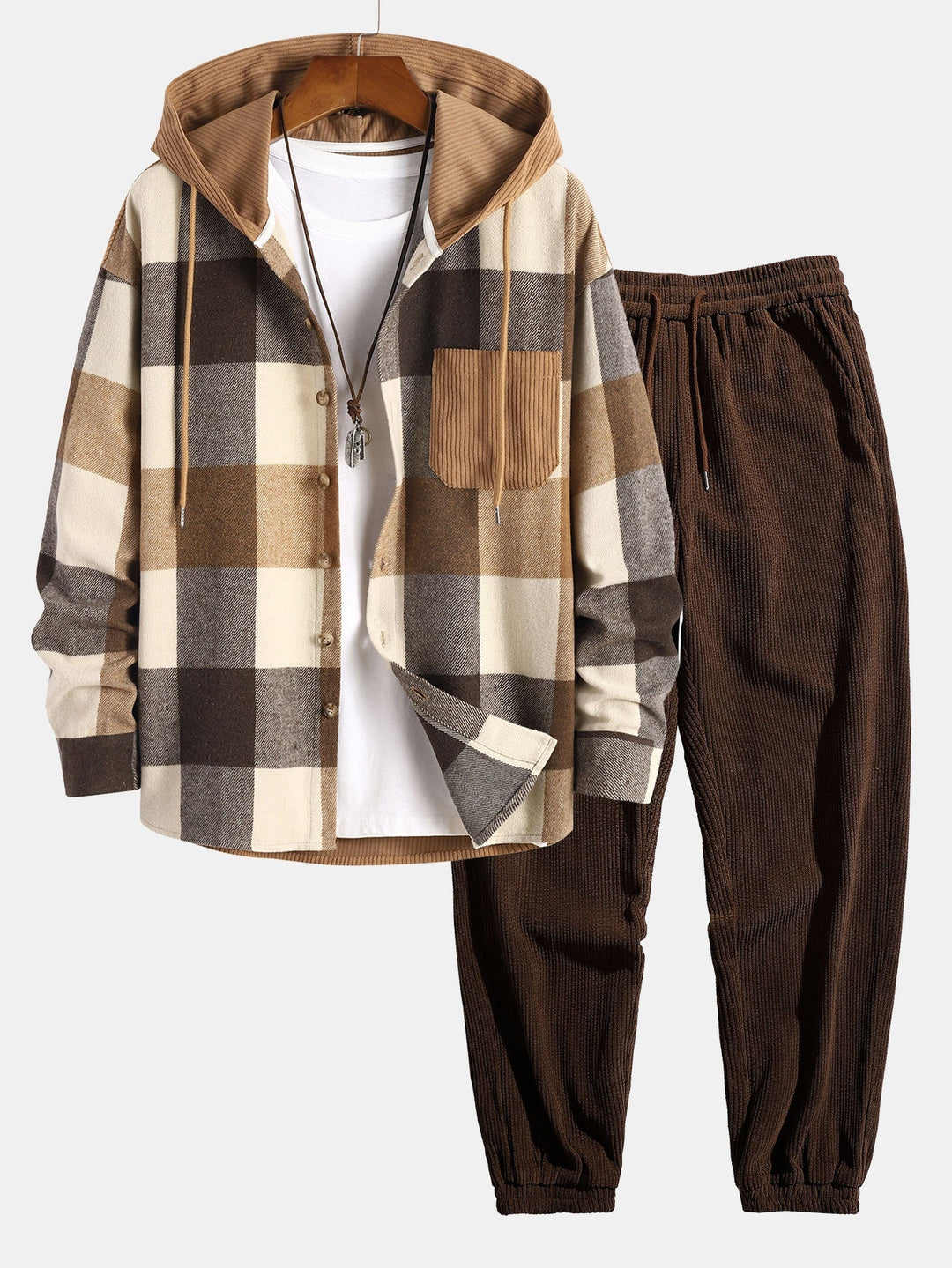 Relax Fit Flannel Plaid Corduroy Patchwork Hooded Shirt & Corduroy Jogger Pants