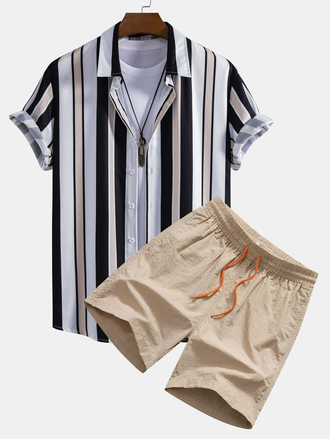 Palm Trees Print Button Up Shirt & Striped Swim Shorts