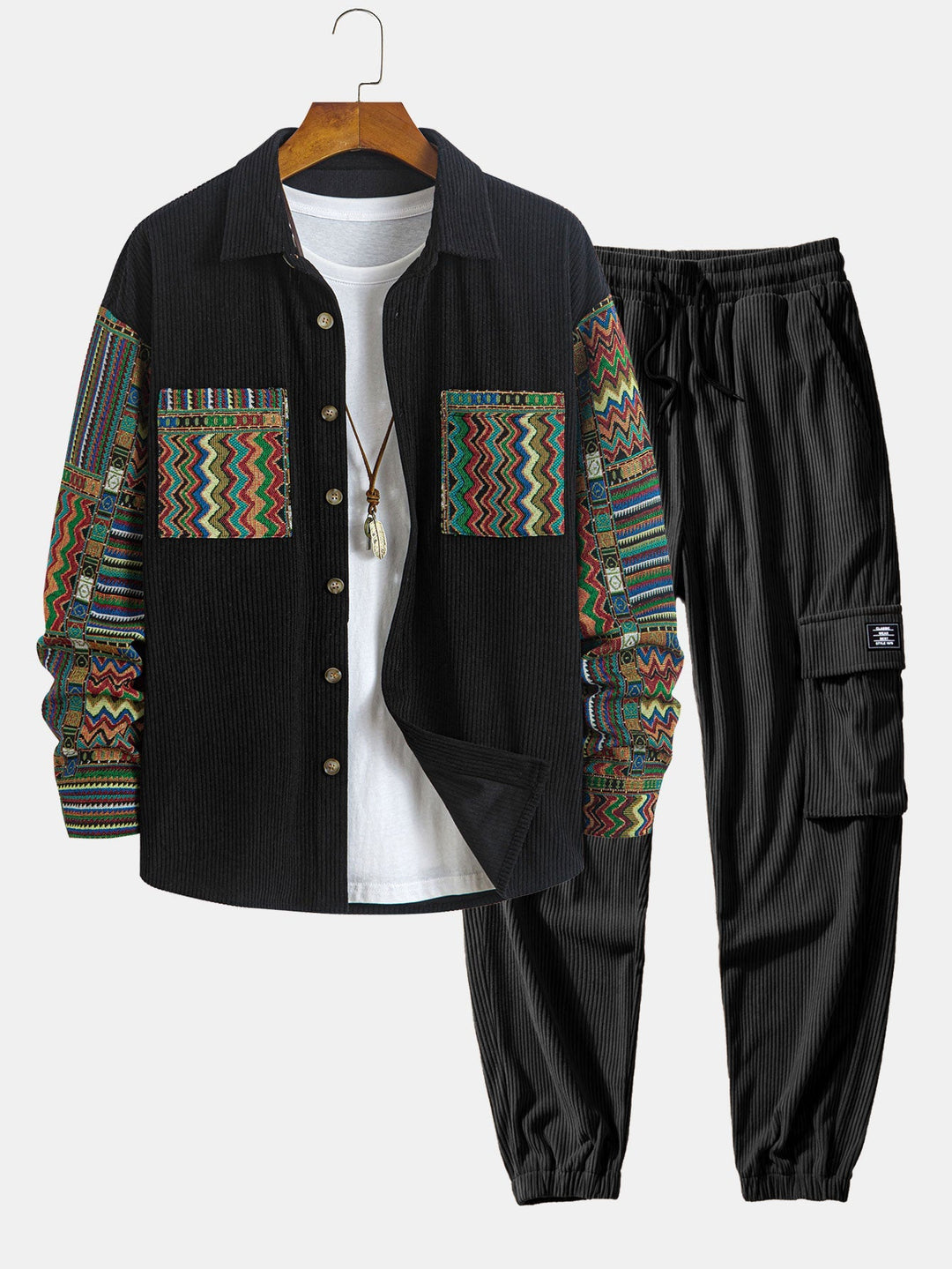 Relax Fit Ethnic Geometric Corduroy Patchwork Shirt # Random Pattern Design # & Drawstring Corduroy Cargo Jogger Pants