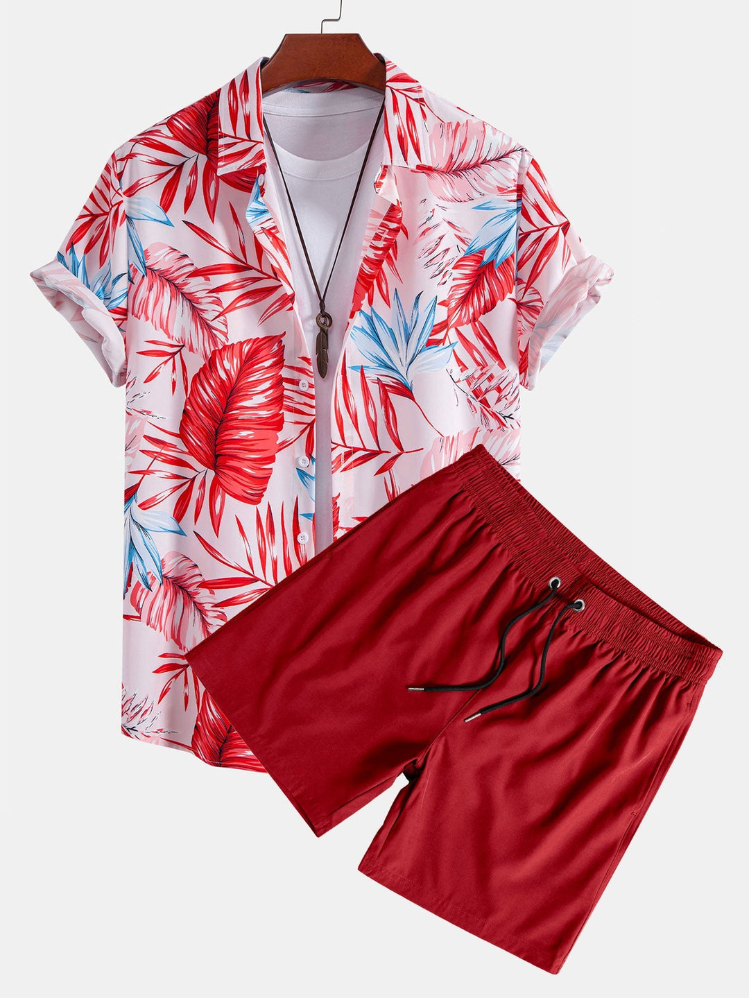 Tropical Plants Print Button Up Shirt & Drawstring Swim Shorts