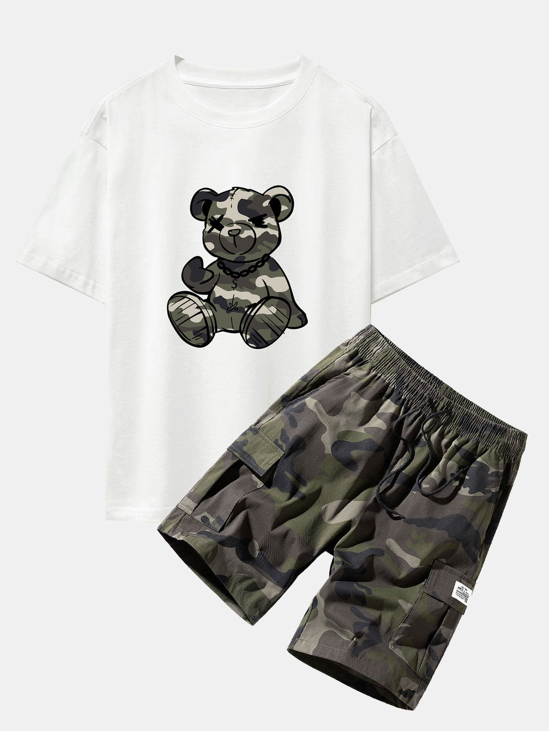 Camouflage Bear Print Drop Shoulder Oversize T-Shirt & Drawstring Cargo Shorts
