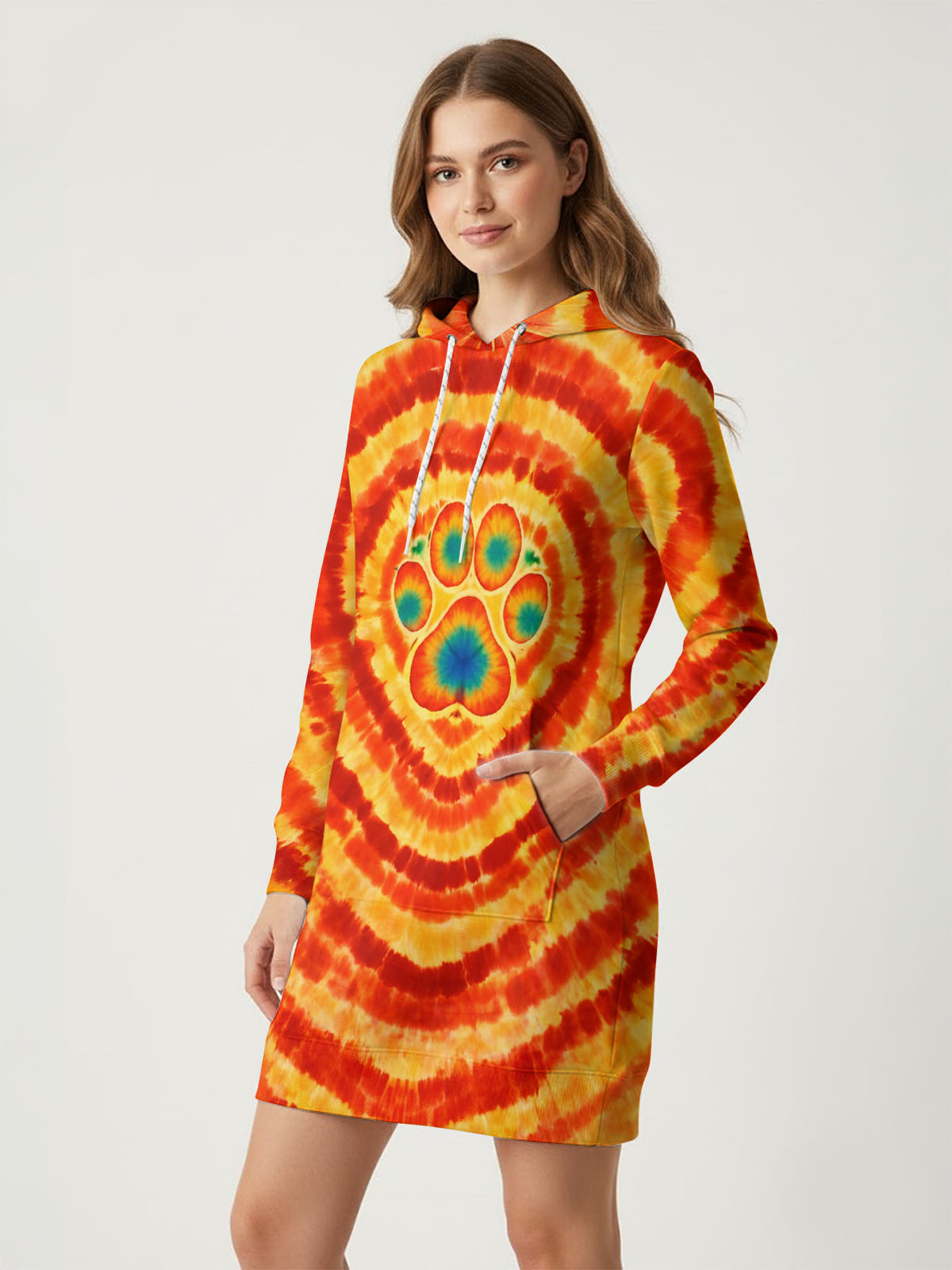 This is more than a hoodie dress it's a wearable love letter to your four-legged soulmate. Designed for women whose hearts belong to their dogs and whose spirits run just as wild, FETCH wraps you in sunset tie dye swirling around the paw print that means everything. They don't just fetch the ball they fetch your heart, your calm, your whole reason to come home. Dog mom. Free spirit. Unapologetically obsessed